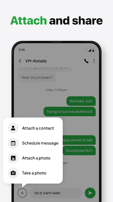 📎 সংযুক্ত করুন এবং শেয়ার করুন - পরিচিতি, ফটো শেয়ার করুন বা অ্যাপ থেকে সরাসরি একটি ছবি ক্যাপচার করুন।