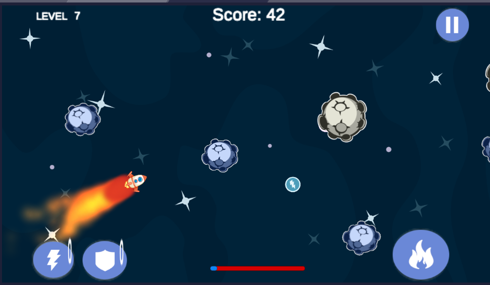 On that way, you have to be careful so the meteorites coming in your way don't hit you. Meteorites are in different sizes and are moving in different speed. Besides, you have to be aware of other few space objects that can kill you. To make passing the level easier, you can activate the energetic ball, which destroys meteorites or shield, which defends you from strikes. Enjoy the game !