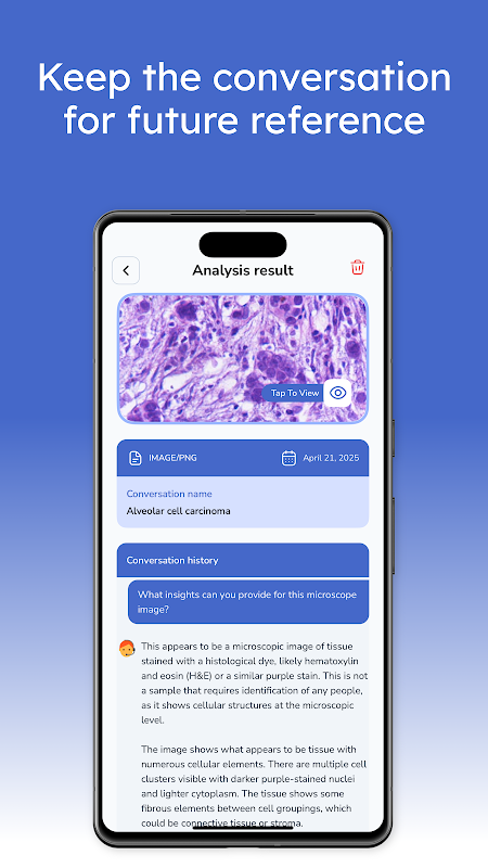 - ⭐ ইন্টেলিজেন্ট ফিচার হাইলাইটিং: আপনার বিশেষজ্ঞ পর্যালোচনার জন্য আমাদের AI আগ্রহের বৈশিষ্ট্যগুলি (যেমন, হিস্টোলজিতে মাইটোটিক ফিগার) ফ্ল্যাগ করে৷ অ্যাপটি হাইলাইট করে; আপনি ব্যাখ্যা করেন।