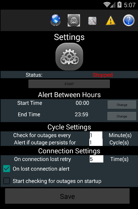 আপনি নেটওয়ার্কের মানচিত্র দেখুন, বর্তমান বিভ্রাটের দেখতে পারেন, বিভ্রাটের স্বীকার, আপনি এটি ব্যাকগ্রাউন্ডে বিভ্রাটের জন্য আপনার ড্যুড সার্ভার চেক চালানো হতে পারে. একটি বিভ্রাটের ঘটনা এটা আপনি বিজ্ঞপ্তি মাধ্যমে সতর্ক করতে পারেন. এছাড়াও আপনি যখন আপনি চান সেটআপ বিজ্ঞপ্তি ঘণ্টা বিভ্রাট একটি বিজ্ঞপ্তি পেতে পারেন এবং আপনি না যখন. আপনিও এটা আপনাকে সতর্ক করে সেখানে ড্যুড সার্ভারের সাথে সংযোগ করতে একটি সমস্যা ছিল পেতে পারেন. আপনি অনেক অন্যান্য সেটিংস কাস্টমাইজ করতে পারেন. এছাড়াও অ্যাপ্লিকেশন সাহায্যের মধ্যে রয়েছে.