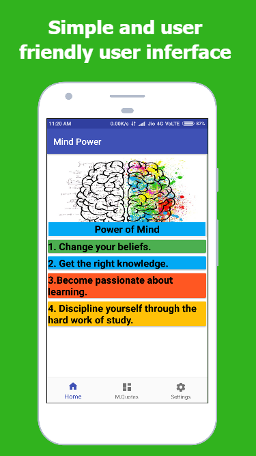 Get the most out of your day with our free mind app. We’ll help you perform at your best through the life-changing skills. Unlock power of mind & learn success ideas for happy life. In just a few minutes a day, you’ll learn how to train your mind and body for a healthier, happier life. All you have to do is download our free Mind: Unlock Superhuman Brain Power App. Start reading for couple of days. You will see massive improvement in your brain power skills and massive successful life. Learn about your abilities and mind power because your mind is the only thing which can direct you to the right path to success. The mind is the most powerful thing in this world. if you learn to use it then you can achieve anything you want. This will tell you about the law of attraction, the power of the mind, positive thinking, success tips, mind tips, map of success, performance tracking and much more.