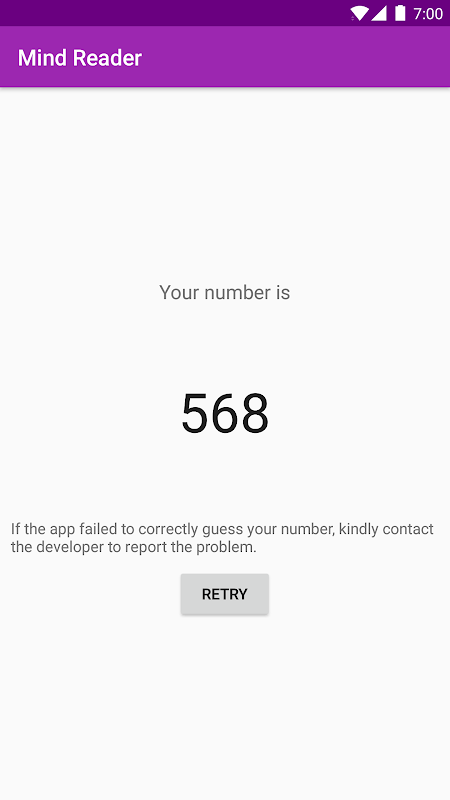 আপনি 1 থেকে 100 এর একটি নম্বর মনে করতে যাচ্ছেন এবং এই অ্যাপ্লিকেশনটি আপনার মনের যে সংখ্যাটি অনুমান করার চেষ্টা করবে। আপনি অ্যাপ্লিকেশনের সেটিংসের মাধ্যমে 1000 পর্যন্ত নম্বর সীমাটি কাস্টমাইজ করতে পারেন।