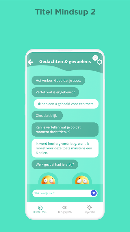 MindsUp helpt je met oefeningen, video’s en tips om toch je gedachten te veranderen. Door antwoord te geven op de vragen die MindsUp je stelt krijg je inzicht in je eigen gedachtepatronen en wordt je gestimuleerd om deze om te buigen naar iets positiefs. Daarnaast biedt MindsUp je de mogelijkheid om een dagboek bij te houden zodat je je gevoelens van je af kunt schrijven.