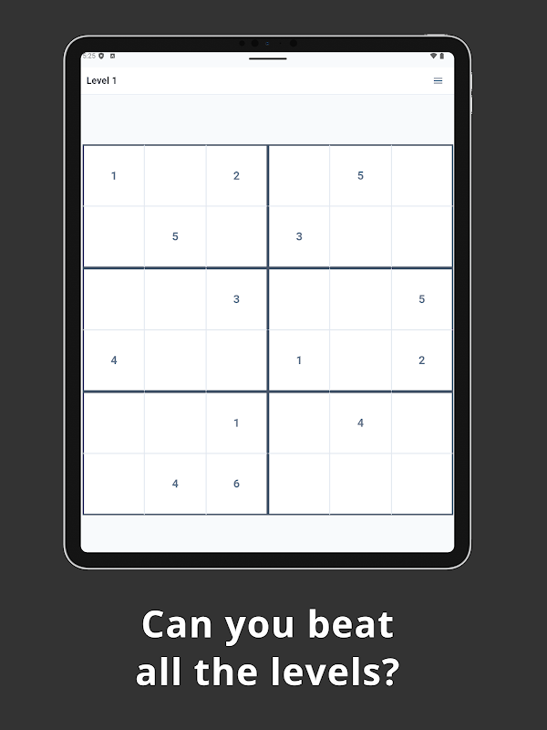 - ক্লাসিক সুডোকু নিয়ম - পুনরাবৃত্তি ছাড়াই 1-6 নম্বর দিয়ে প্রতিটি সারি, কলাম এবং 2x3 বাক্স পূরণ করুন।