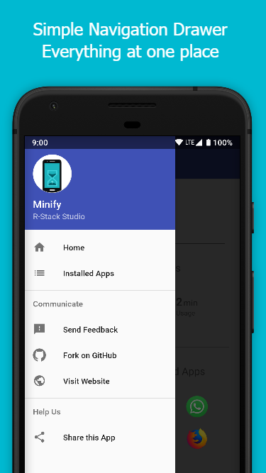 "Minify ©" - বিশেষ করে যারা তাদের স্মার্টফোনে ব্যয় করা সময় সংরক্ষণ করে তাদের প্রোডাক্টিভিটিটি উন্নত করতে চায় এমন একটি অ্যাপ। এই অ্যাপ্লিকেশানটি ব্যবহারকারীর ক্রিয়াকলাপগুলি ট্র্যাক করে এবং প্রতিটি অ্যাপে নেওয়া মোট সময়কে পরিমাপ করে এবং এভাবে আপনি নিজেকে ট্র্যাক করতে সক্ষম হতে পারেন। আপনি নির্দিষ্ট অ্যাপ্লিকেশানগুলির সীমাও সেট করতে পারেন, Minify © আপনার অত্যধিক বেদনাদায়ক সময় সংরক্ষণের জন্য আপনাকে বিজ্ঞপ্তি এবং সতর্কতাগুলি প্রদান করবে।