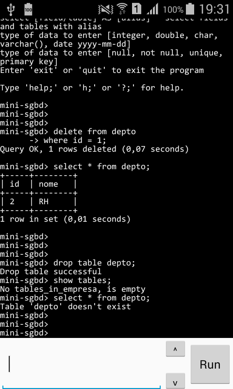 MiniSGBD Execute SQL (DBMS), is an educational application to assist or learn the SQL language. The application runs the basic SQL commands through a command-line interface (Terminal), commands and queries are basically a first-time view with MySQL when executed by the command line. The data is saved and can be queried, also have a list of previous commands executed. Here is a list of possible operations.