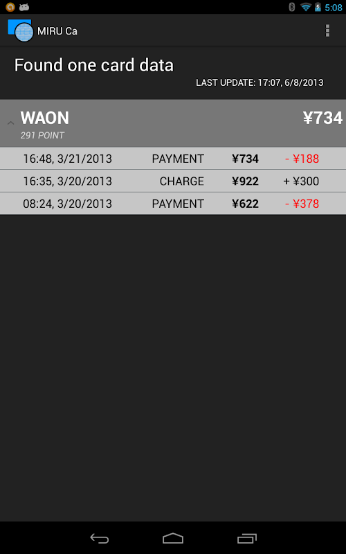 এটি একটি অ্যাপ্লিকেশন যে ইতিহাস প্রদর্শন করা হয় এবং ইলেকট্রনিক টাকানেই হয়, পরিবহন ব্যবস্থা আইসি কার্ড (সুইকা, ইকোকা, PASMO এবং আরো).