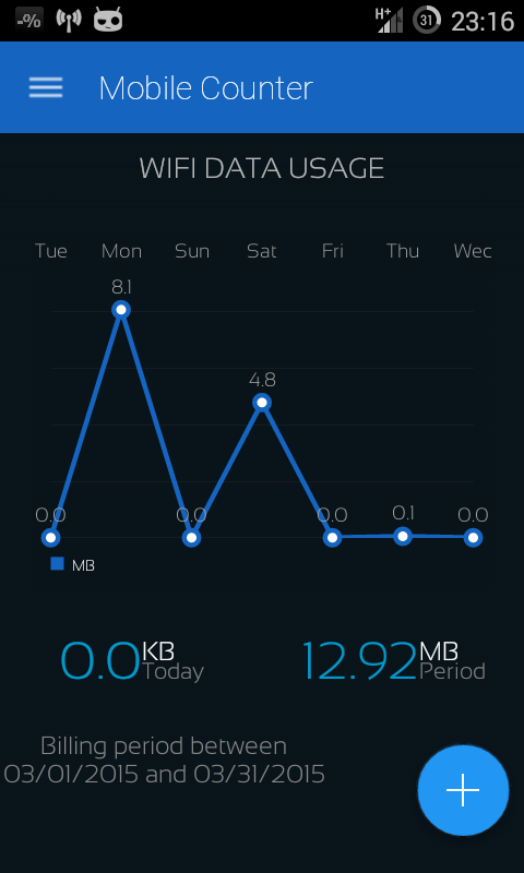 এটি মোবাইল কাউন্টার 3 জি, ওয়াইফাইয়ের মতো একই অ্যাপ্লিকেশন তবে ম্যাটেরিয়াল ডিজাইনের সাথে (নতুন অ্যান্ড্রয়েড 5.0 লেআউট)।