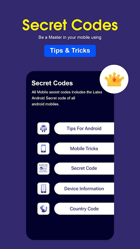 বিনামূল্যে মোবাইল সিক্রেট কোড এবং টিপস অ্যাপ ইনস্টল করুন, লুকানো সেটিংস এবং গোপন হ্যাকগুলি পান এবং আপনার অ্যান্ড্রয়েড ডিভাইসের একটি গোপন জগত আনলক করুন!