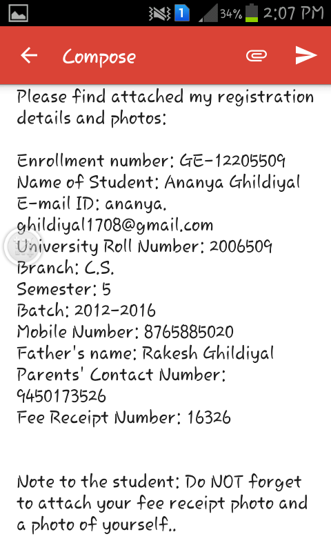 The 'Register' menu includes our main application form for registration. It opens up a page which accesses the mobile camera. The user has to simply click two pictures: one of his/her fee-receipt and the other of his/her own self. On clicking the 'Next' button, the registration form opens which contains the parameters that need to be filled (and are present in the Graphic Era semester registration form) by the user (student) for registration. We have added validations on the fields so that no user submits blank form or wrong values while simultaneously allowing multiple correct inputs (like for name: Abc, Abc Xyz, A. X. Yzabc, etc are possible). On clicking the 'Next' button, the user is directed to a page from where he/she can mail his/her information to the administrator. On clicking the 'Send Email' button, the device's e-mail service is accessed and an e-mail is displayed to the user which has sender field filled with admin ID '[email protected]' and the body of the e-mail contains all form entries the user had filled. It also reminds the user to attach the two pictures (of himself/herself and his/her receipt) clicked by him/her to the e-mail. After sending the mail, the user is directed back to the page with the 'Send Email' button. This page also has an 'Exit' button which on clicking, asks for confirmation to exit, and then moves the application to the background (as it is good practice to not forcibly kill an Android application and followed by all Android applications like Google Chrome, Whatsapp, Flickr etc which on exiting are only minimised and still run in the background).