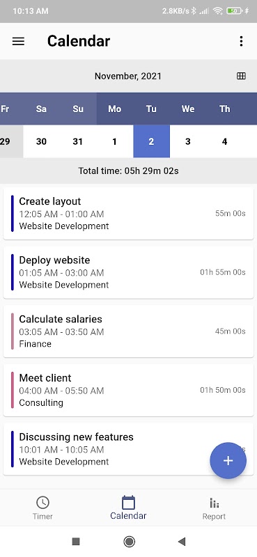 ক্যালেন্ডার স্ক্রিনে আপনি আপনার সমস্ত সময় এন্ট্রি ব্রাউজ করতে পারেন, প্রকল্প/টাস্ক এবং সাজানোর দ্বারা ফিল্টার করতে পারেন। যেকোনো সময় এন্ট্রিতে আলতো চাপুন এবং আপনি এটির বিবরণ দেখতে পাবেন: