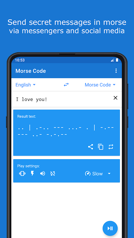 মেসেঞ্জার এবং সামাজিক নেটওয়ার্কের মাধ্যমে বন্ধুদের সাথে morse আপনার টেক্সট শেয়ার করুন। অ্যাপ্লিকেশন এছাড়াও অন্যান্য অ্যাপ্লিকেশন থেকে পাঠ্য গ্রহণ করতে পারেন।