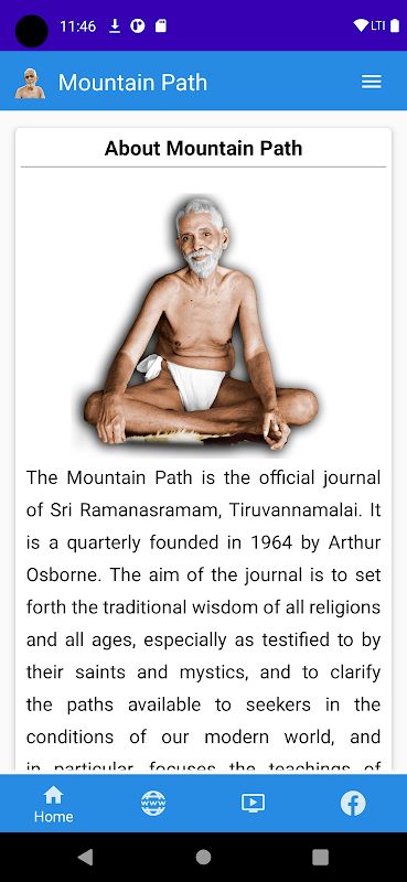 The Mountain Path is the official journal of Sri Ramanasramam, Tiruvannamalai. It is a quarterly founded in 1964 by Arthur Osborne. The aim of the journal is to set forth the traditional wisdom of all religions and all ages, especially as testified to by their saints and mystics, and to clarify the paths available to seekers in the conditions of our modern world, and in particular, focuses the teachings of Bhagavan Sri Ramana Maharshi and the school of Advaita Vedanta as enunciated by AdiSankara. There are translations from time-honoured Sacred Tamil and Sanskrit texts which elucidate the teachings. The journal also contains articles that are relevant to seekers in our modern age as well as news and information about the activities at Ramanasramam.