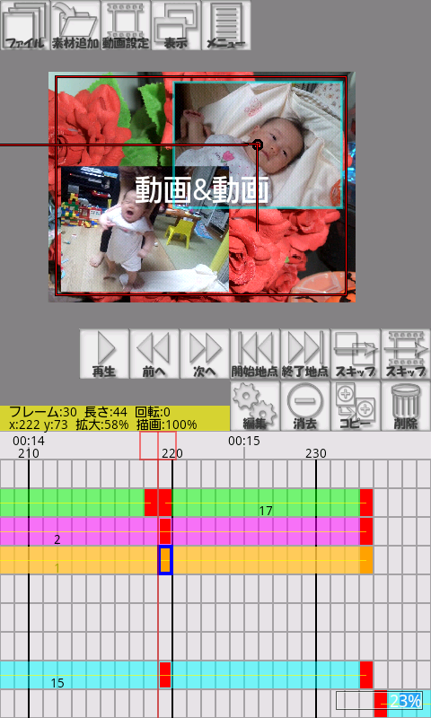 フレーム単位で自由に編集でき、写真と動画の組み合わせや、写真とエフェクトだけで動画を作ってみたりと、好きな動画を作りこむことができます。