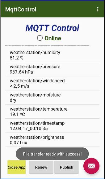 সাবস্ক্রাইব করা বিষয়ের জন্য প্রাপ্ত ডেটা এবং সংশ্লিষ্ট বিষয়ের নাম সহ একটি তালিকা (ArrayList/ListView) প্রদর্শিত হয়, এছাড়াও একটি SD কার্ডের একটি .txt ফাইলে রপ্তানি করা যেতে পারে। এই ফাইলের নাম বর্তমান টাইম স্ট্যাম্প থেকে তৈরি করা হয়েছে। ফাইলগুলি /sdcard/MqttControl ফোল্ডারে সংরক্ষিত হয়। এটি করার জন্য, বাহ্যিক মেমরি উপলব্ধ হতে হবে এবং এই মেমরি অ্যাক্সেসের জন্য রিলিজ প্রকাশ করতে হবে।