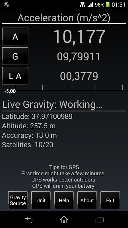 This app gives you the ability to calculate the gravity precisely on your location using GPS and the WGS84 system. Dont just use the 9.81m/s2 or 32.2ft/s2 approximation but get the exact ellipsoid model value on your location.