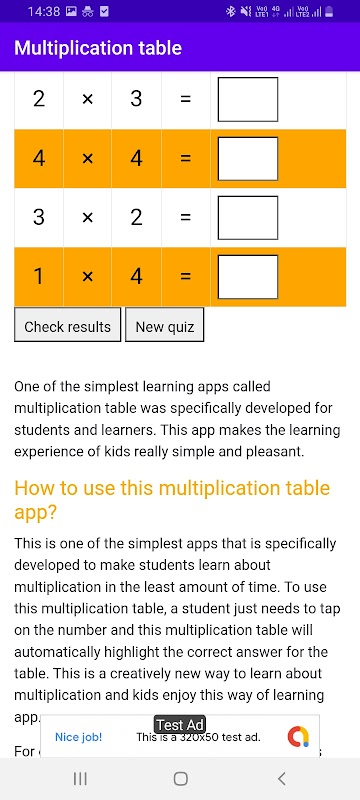 শেষ কিন্তু অন্তত নয়, এই লার্নিং অ্যাপে ডিফল্টরূপে একটি AI-ভিত্তিক গুণন পরীক্ষা রয়েছে। এই পরীক্ষার সাহায্যে, শিক্ষার্থীদের এই অ্যাপে 10টি এলোমেলো প্রশ্নের উত্তর দিতে হবে এবং একবার সমস্ত উত্তর দেওয়া হয়ে গেলে, তারা এই গুণন সারণী শেখার অ্যাপের চেক উত্তর বৈশিষ্ট্যে সঠিক উত্তরটি পরীক্ষা করতে পারবে।