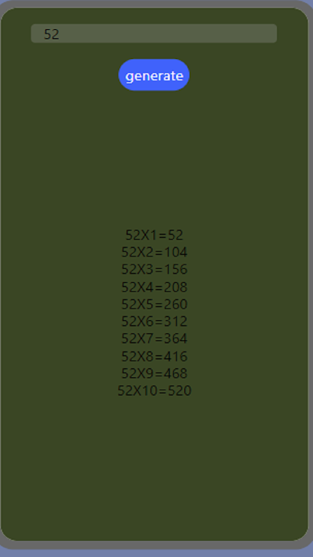 This is a multiplication tables APP. It will generate multiplication tables. This helps for kids and adults to learn maths.