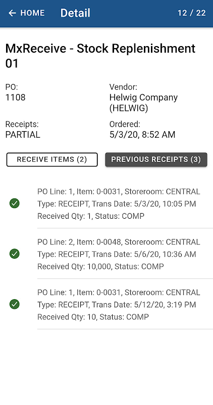 MxReceive by A3J Group, LLC is a mobile application for receiving parts and material from vendors within IBM Maximo Asset Management. Rather than capturing information on paper and transcribing the information into the system on a desktop computer, MxReceive allows users to receive parts and material right at the source. Users can scan item or purchase order barcodes or QR codes to locate records, receive immediate feedback if inspections are required, and receive material in Maximo in real-time from their devices. MxReceive makes receiving parts easy, which builds organizational trust in their data. All on the go, and all using the authorized IBM Maximo API's.