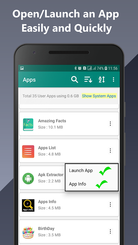 The The App shows All install User Apps and System apps, you can Launch an app, see app details like APK Size, App Version, Permissions, Battery, Memory and Data Usage by each apps.