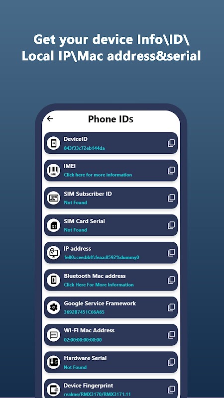 এই অ্যাপ্লিকেশনটি ব্যবহার করে আপনি সহজেই আইডি তথ্য পেতে পারেন যা আপনি সহজেই অনুলিপি এবং ভাগ করতে পারেন।