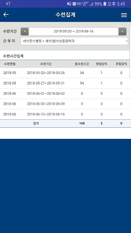 조회기간(주별/텀별/월별) 을 선택하여 해당 기간에 따른 총수련시간, 평일당직 및 주말당직 횟수 등을 편리하게 집계할 수 있습니다