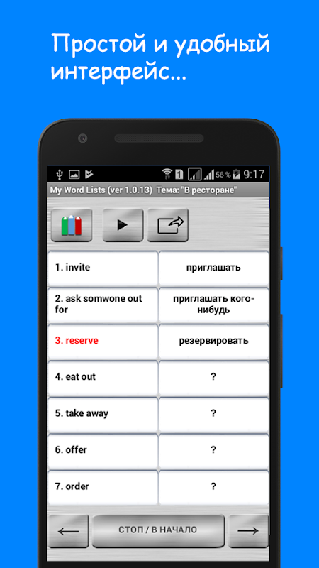 আমার শব্দ তালিকা - সুচী আকারে ইংরেজি শব্দের আপনার শব্দভান্ডার পরিচালনার জন্য একটি সহজ এবং সুবিধাজনক প্রোগ্রাম। আপনার স্মার্টফোন মধ্যে - এখন আপনি কাগজে বা কম্পিউটারে থাকা সমস্ত আপনার পুরানো রেকর্ড সংগ্রহ ও তাদের এক জায়গায় একত্রিত করতে পারেন! নতুন অভিধান, বিভিন্ন বিষয়ের উপর তালিকা তৈরি করতে নতুন শব্দ পরিচয় করিয়ে, মুছুন এবং তাদের এক তালিকা থেকে অপরের সরানো, এবং অবশ্যই সম্পাদনা করতে "মাছি উপর" অনুমতি দেয়। যখন লেখা এবং নতুন শব্দ রেকর্ডিং আপনি অবিলম্বে, অনলাইন সংযুক্ত অভিধান ব্যবহার করে তাদের অনুবাদ পেতে পারেন তাদের সঠিক উচ্চারণ শুনুন।