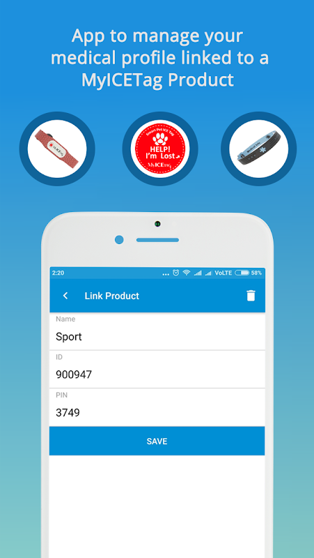 ## এছাড়াও অ্যাপ্লিকেশানটি আপনার MyICETag প্রোফাইল ও আপনার MyICETag ব্রেসলেট, স্টিকার, বা অন্যান্য MyICETag পণ্যের সঙ্গে লিংক পরিচালনা করার জন্য জরুরি অবস্থা তথ্য প্রদান করার জন্য আপনাকে আপনার সাথে আপনার ফোন না যখন পারেন।