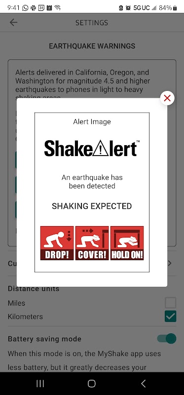 ক্যালিফোর্নিয়া, ওরেগন এবং ওয়াশিংটনে সময়মত, সম্ভাব্য জীবন রক্ষাকারী প্রারম্ভিক সতর্কতা সতর্কতা গ্রহণ করুন। MyShake USGSShakeAlert< ব্যবহার করে ঝাঁকুনি আসার কয়েক সেকেন্ড আগে 4.5 মাত্রার (বা তার বেশি) ভূমিকম্পের জন্য সতর্কতা প্রদান করার সিস্টেম।