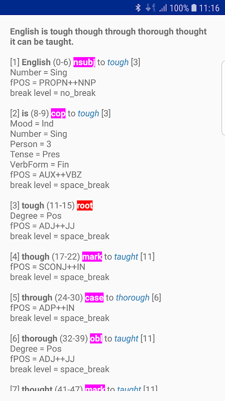 বাক্যগুলি পার্স করে এবং তাদের সিনট্যাকটিক কাঠামো বিশ্লেষণ করে (লেবেলযুক্ত নির্ভরতার আকারে)। গুগলের সিনট্যাক্স নেট প্রাকৃতিক ভাষা বোঝার এবং টেনসরফ্লো মেশিন লার্নিং ফ্রেমওয়ার্কের ভিত্তিতে।