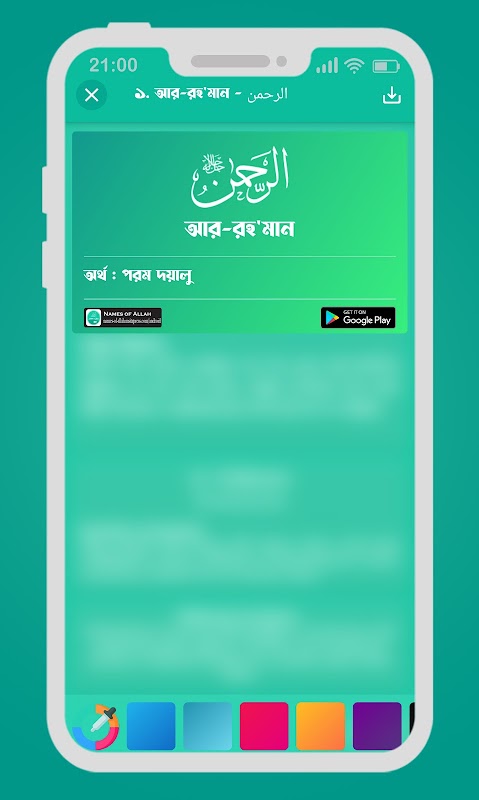 আল্লাহর ৯৯টি নাম - বাংলা ও ইংরেজি অ্যাপটি ৫* রেটিং এবং আত্মীয়-সজন, বন্ধু-বান্ধবের সাথে শেয়ার করে আপনিও ইসলাম প্রচারে অংশ নিন।