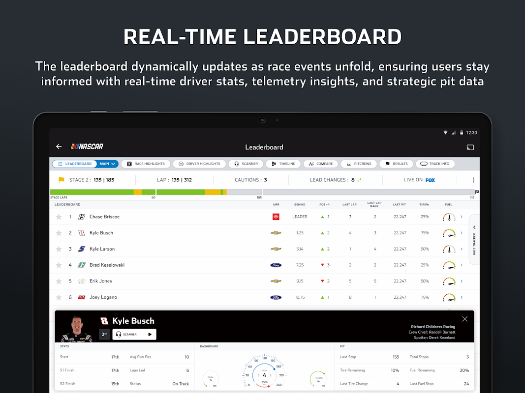 - রেস, যোগ্যতা, এবং অনুশীলন সেশন সহ সমস্ত NASCAR সিরিজের জন্য লাইভ লিডারবোর্ড।