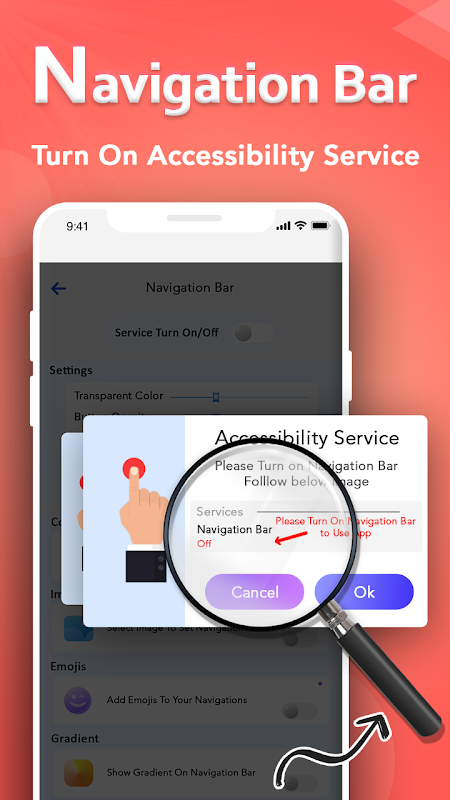 কাস্টম নেভিগেশন বার অ্যাপ্লিকেশনটি দুর্দান্ত একটি নেভিগেশন বার তৈরি করতে বেশ কয়েকটি বৈশিষ্ট্য এবং রঙ সরবরাহ করে। দৃ navigation় স্পর্শ হিসাবে এটিকে নেভিগেশন বার সোয়াইপ এবং ডাউন করা সহজ it এটি আপনার সাধারণ নেভিগেশন বারকে আশ্চর্যজনক ইমোজি নেভিগেশন বারেও পরিবর্তন করেছে and এবং সর্বোত্তম সুবিধাগুলির মধ্যে একটি হ'ল আপনি নিজের পছন্দসই "ইমোজি" দিয়ে আপনার নেভিগেশন বারটিও ডিজাইন করতে পারেন।