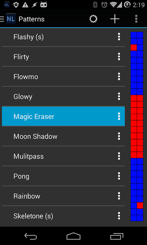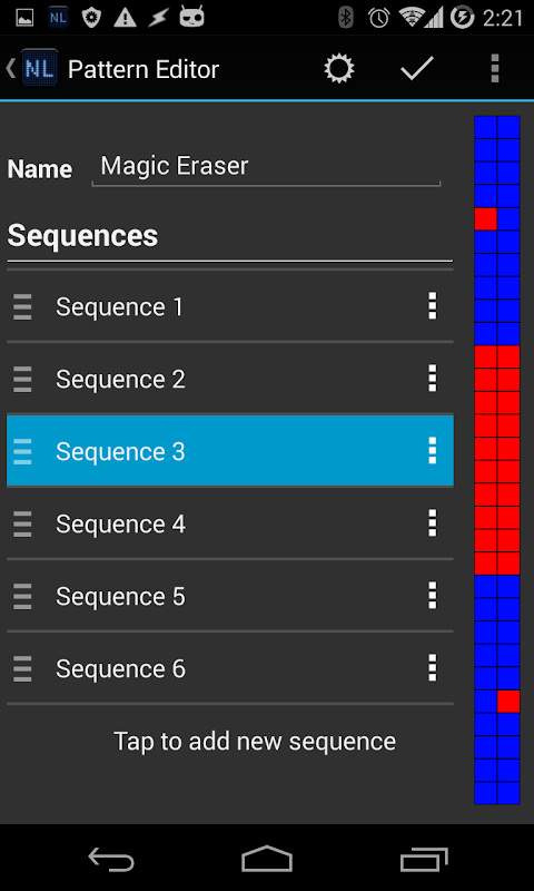 Nebulights ইতিমধ্যে পরিকল্পিত নিদর্শন আপনার কাছ থেকে চয়ন জন্য একটি তালিকা সাথে আসে, কিন্তু লাগেনা এটা ঘাম যদি ই.এম. মত লাগেনা, আপনি আপনার নিজের করতে পারেন! প্রতিটি প্যাটার্ন যে Nebulights দিয়ে আসে Nebulights অ্যাপ্লিকেশন দিয়ে পরিকল্পনা করা হয়েছিল। সরল শক্তিশালী প্যাটার্ন সম্পাদক লিখুন এবং তৈরি কি আপনার মেজাজ মামলা!