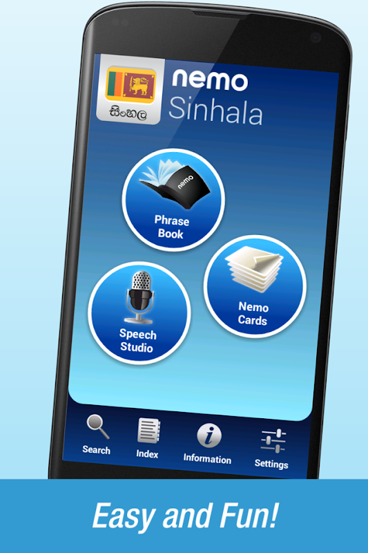 আপনি যে কোনো সময়ে শিখতে চাই মধ্যে ডুব. Phrasebook একটি সিংহলী-ইংরেজি অভিধান ইন্টারফেসের মাধ্যমে app এর মধ্যে শব্দভান্ডার দ্রুত এক্সেস প্রস্তাব. নিমো একটি অনুবাদক হিসেবে কাজ. শুধু আপনি সার্চ ইন্টারফেস প্রয়োজন শব্দ খুঁজে পেতে এবং ডিভাইস স্পিকার মাধ্যমে তার অডিও এবং খেলার.