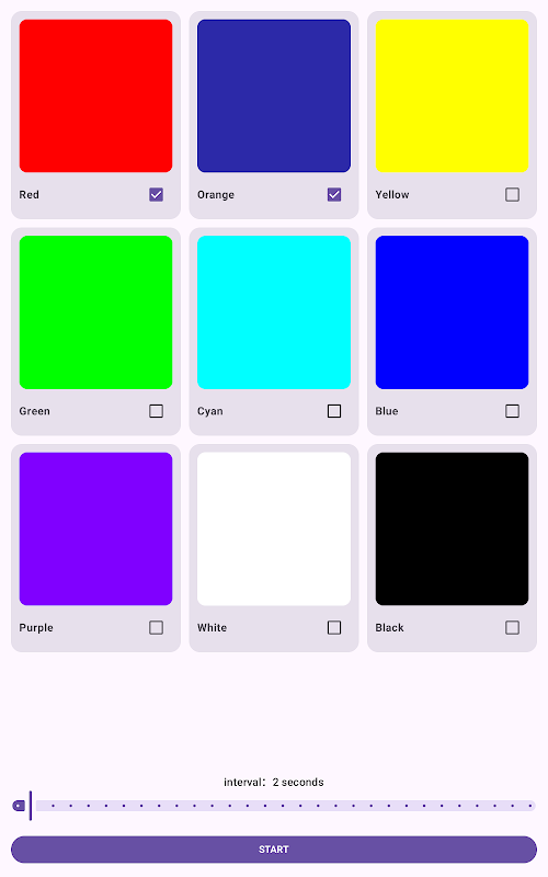 Check one or multiple colors → tap START → enjoy fullscreen color