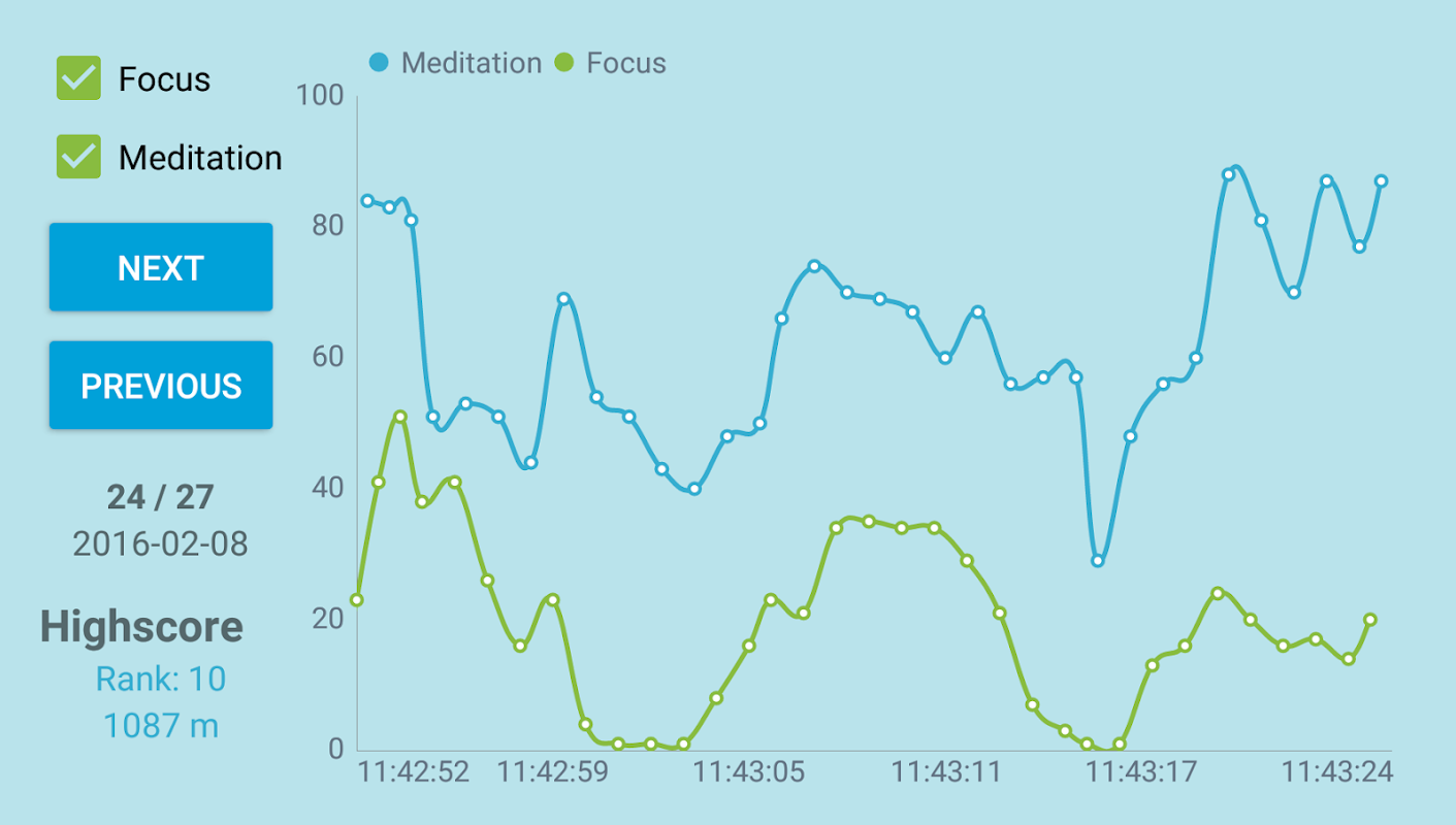 - বিশ্লেষণ: মনোযোগ স্তর এবং প্রতিটি খেলার জন্য ধ্যান স্তর সংরক্ষণ করা হচ্ছে. সময় মনোযোগ স্তর এবং ধ্যান স্তর পরিবর্তনের প্লট অঙ্কন. প্রশিক্ষণ অগ্রগতি সম্পর্কে প্রতিক্রিয়া পান.