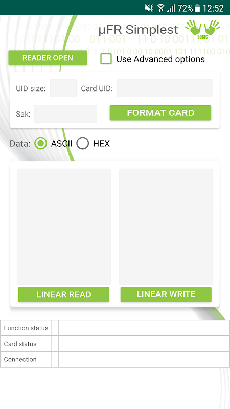 অ্যাপটির জন্য বাহ্যিক µFR সিরিজ এনএফসি রিডার দরকার: https://www.d-logic.net/nfc-rfid-reader-sdk/