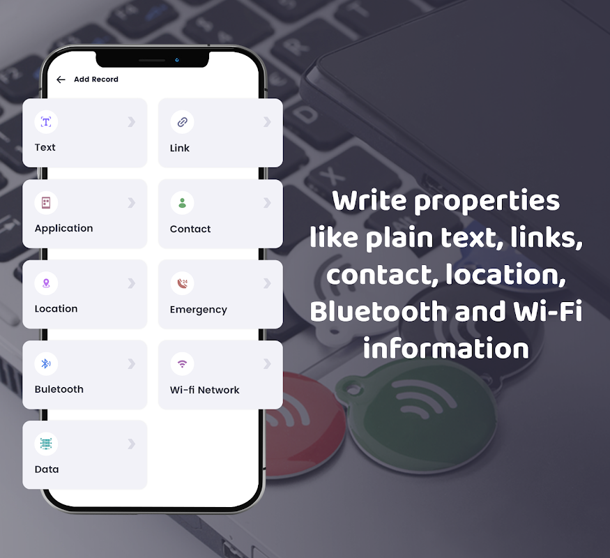 কাস্টম রেকর্ড লিখুন (টেক্সট, ইউআরএল, যোগাযোগ, এসএমএস, ইমেল, ব্লুটুথ, ওয়াইফাই, অ্যাপ লঞ্চ এবং আরও অনেক কিছু)