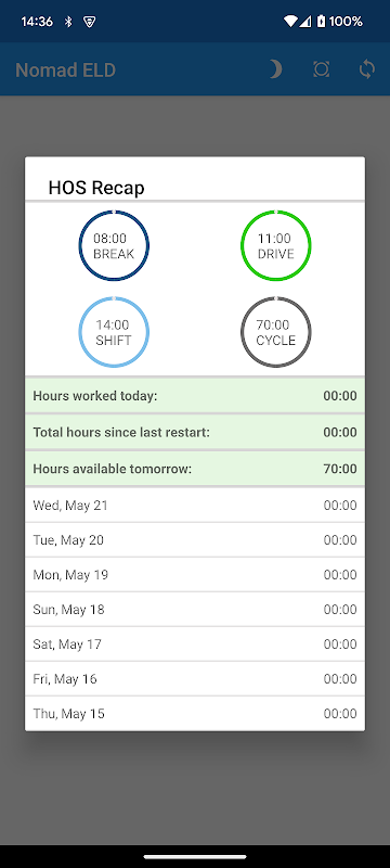 • 60-ঘন্টা/7-দিন এবং 70-ঘন্টা/8-দিনের চক্রের অধীনে ড্রাইভারের সময় নিরীক্ষণ করে