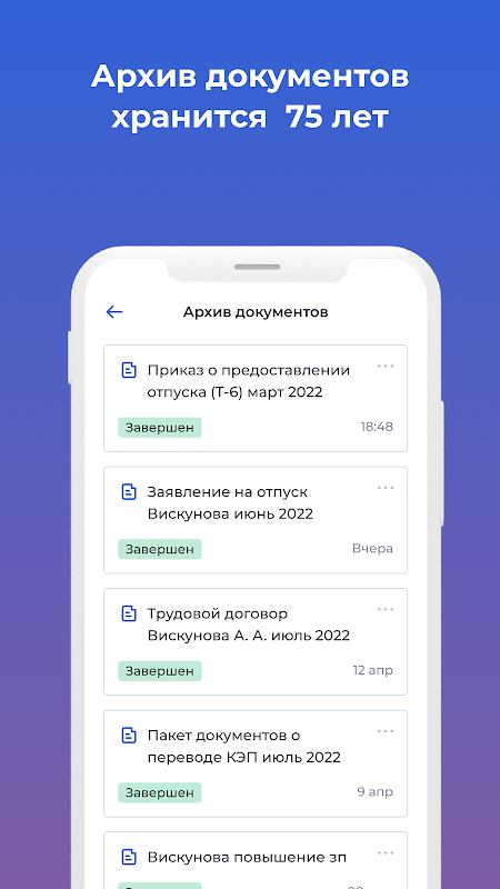 একটি স্মার্টফোনে কর্মীদের কর্মপ্রবাহ। বিতরণ করা দলগুলির জন্য একটি বৈদ্যুতিন স্বাক্ষরের অনলাইন প্রকাশের সাথে, এটি 1s এর সাথে কাজ করে, অনাবাসীদের সাথে। 63FZ এবং রাশিয়ান ফেডারেশনের শ্রম কোডের সাথে মিলে যায়।