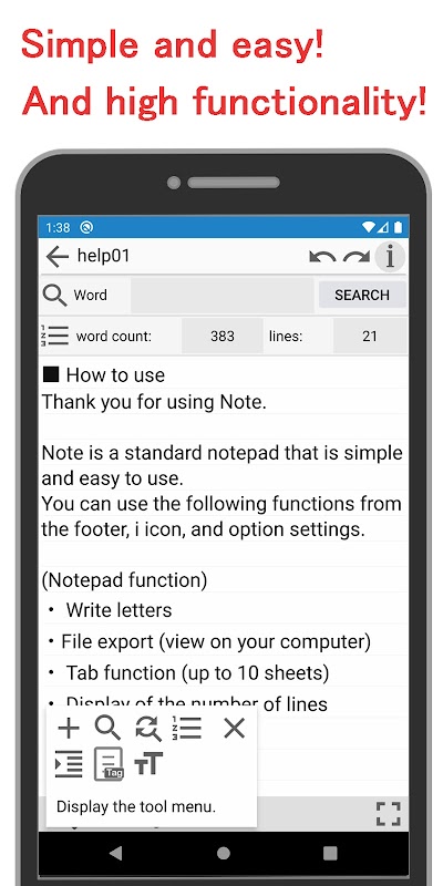 যদিও এটি দেখতে সহজ, এটির অনেকগুলি স্ট্যান্ডার্ড ফাংশন রয়েছে এবং এটি একটি ব্যবহারযোগ্য মেমো প্যাড যা বিভিন্ন ফাংশনগুলির সাথে যেমন অগ্রাধিকার অনুসারে বাছাই করা, বিভাগগুলি পরিচালনা করা এবং অক্ষর এবং লাইনের সংখ্যা গণনা করা।
