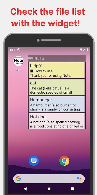 The note is saved automatically. You can use note functions such as saving to a terminal, backing up files, displaying the number of characters and lines, searching sentences, replacing characters, moving lines, and changing colors.