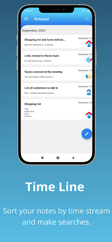 ⦁আপনি এই অ্যাপটিকে একটি ডায়েরি, জার্নাল বা কেবল ভবিষ্যতের রেফারেন্সের জন্য আপনার সমস্ত চিন্তাভাবনা সংরক্ষণ করার জায়গা হিসাবে ব্যবহার করতে পারেন। টাইমলাইন ভিউ আপনি সময়ের সাথে কী লিখেছেন তা দেখা সহজ করে তোলে।