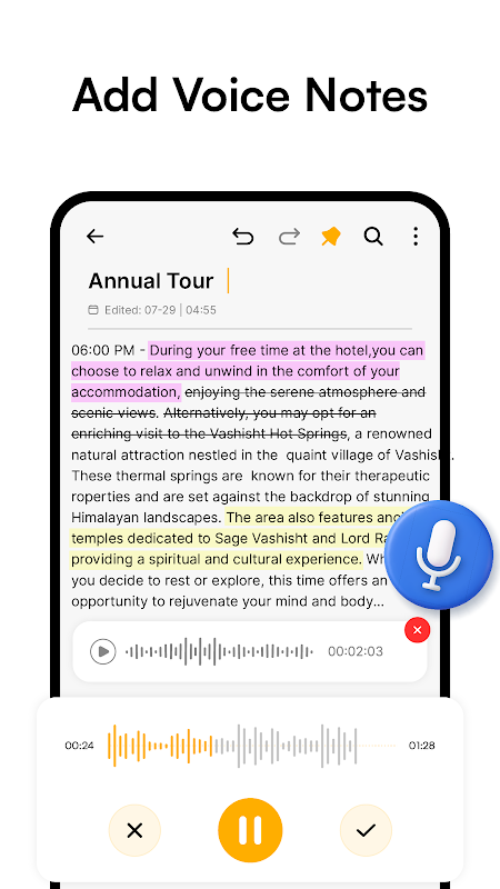 🎤 ভয়েস নোট: যখন টাইপ করা সুবিধাজনক নয় তখন সেই মুহূর্তগুলির জন্য ভয়েস নোট রেকর্ড করুন। মিটিং, বক্তৃতা বা দ্রুত অনুস্মারকের জন্য উপযুক্ত।