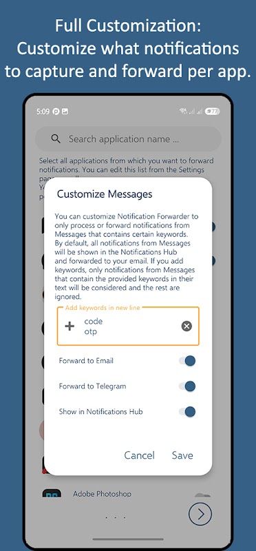 ✅ সম্পূর্ণ কাস্টমাইজেশন: আপনি প্রতিটি অ্যাপকে শুধুমাত্র নির্দিষ্ট কীওয়ার্ড সম্বলিত নোটিফিকেশন বা সমস্ত অ্যাপের নোটিফিকেশন ফরোয়ার্ড করার জন্য সংজ্ঞায়িত করতে পারেন।