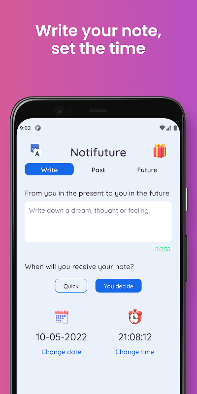 Select the date and time you want, up to a maximum of 1 year. Or get practical with a quick selection of popular presets. It's entirely your choice. After you set the time, write your note and send it. Now your note is on its way to reach you.