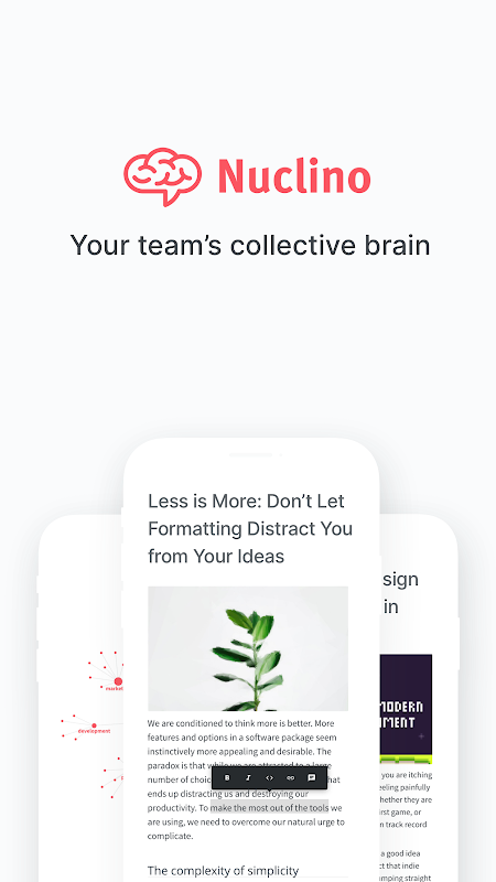 Nuclino আপনার দলের সমস্ত জ্ঞান, ডক্স এবং প্রকল্পগুলিকে এক জায়গায় নিয়ে আসে৷ ফাইল এবং ফোল্ডার, কনটেক্সট স্যুইচিং বা সাইলোর বিশৃঙ্খলা ছাড়াই এটি সহযোগিতা করার একটি আধুনিক, সহজ এবং উজ্জ্বলভাবে দ্রুত উপায়। 12,000 টিরও বেশি দল এবং কোম্পানিতে যোগ দিন যারা নিউক্লিনোকে তাদের সম্মিলিত মস্তিষ্ক তৈরি করেছে।