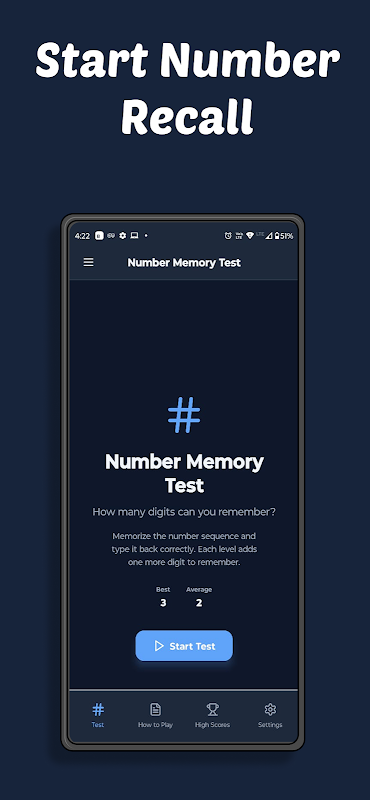 আজই নম্বর মেমরি টেস্ট ডাউনলোড করুন এবং আপনার মস্তিষ্ককে চ্যালেঞ্জ করা শুরু করুন! আপনি কত সংখ্যা মনে করতে পারেন?