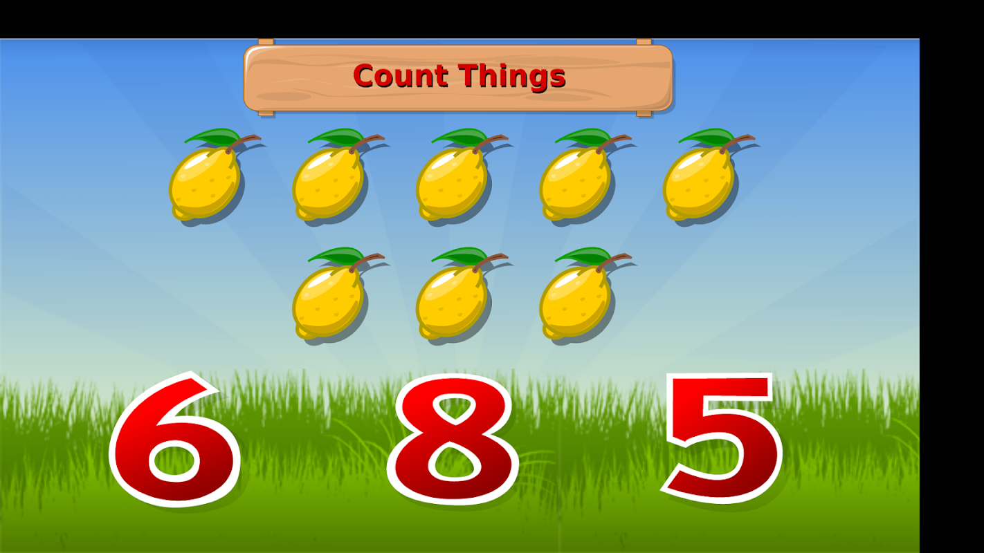 “COUNT THINGS”, “PICK THE NUMBER”, “MISSING DIGIT”, “GROUPS” games are aimed to help children connect an amount of items to a corresponding number, its appearance and a word for it. They will also reinforce counting skills and help remember how the numbers look like.